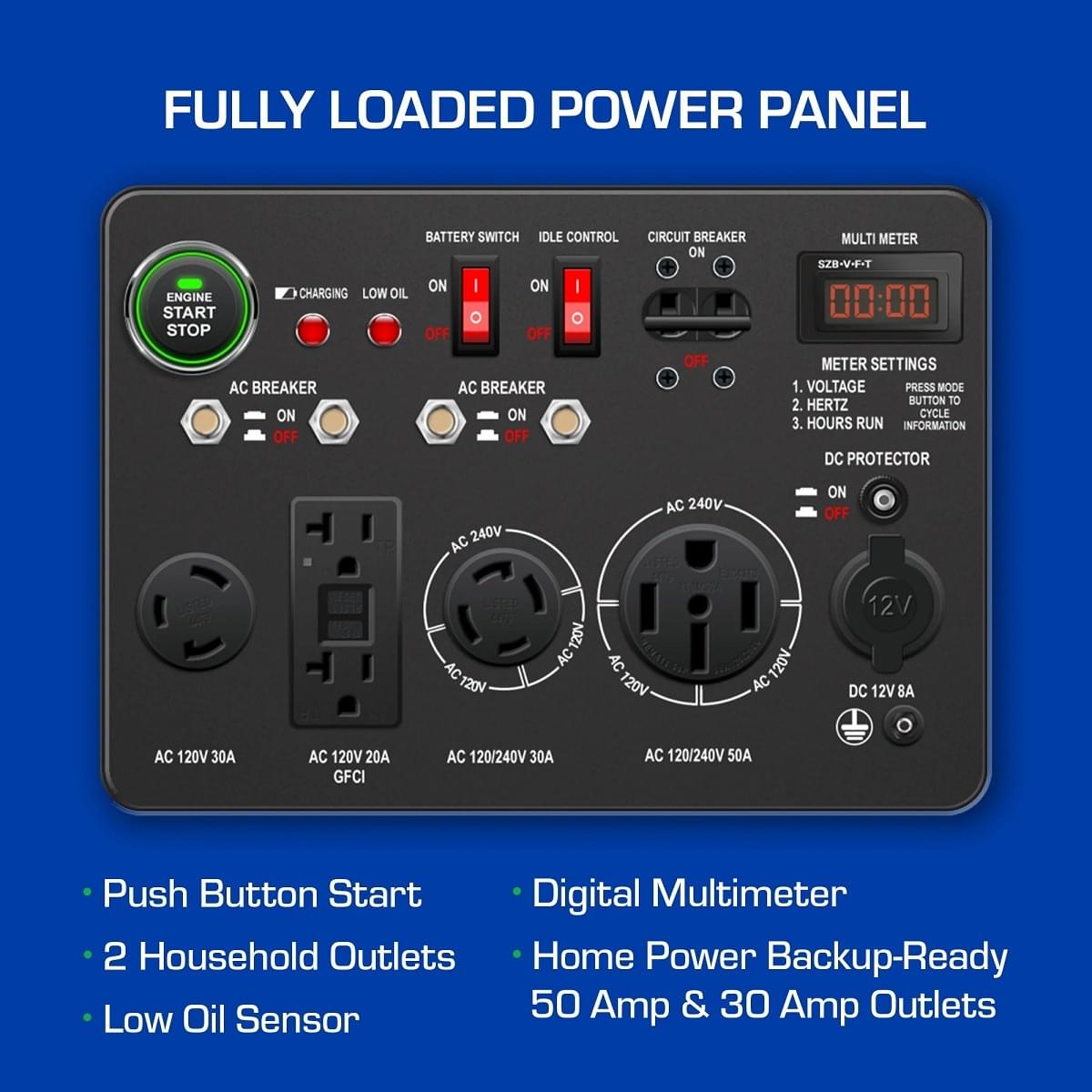 Fully Featured Power Panel – The power panel includes a wide selection of outlets for maximum compatibility in your applications including: 2 120V household GFCI outlets, 1 120V 30A twist lock outlet, 1 240V 30A outlet, and 1 240V 50A outlet, and a 12V automotive outlet. The panel also includes a digital voltmeter.